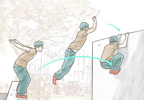 Leap like a cat. In a "cat leap," the traceur jumps onto the face of a wall and uses all four limbs for grip and balance. While in the air, position your arms in front of you so that your hands can grip the wall ledge when landing. Orient your legs to be nearly parallel with your arms and so that your feet will connect with the wall's face first. Allow your legs to absorb the impact, bend at the knee, and catch the ledge with your hands. A cat leap can be done using almost any type of leap as a base, from running jumps to vaults. As long as you can orient your body so that all four of your limbs can extend forward, you can turn a normal leap into a cat leap. In practice, this move is typically used to reach slightly higher surfaces. From this position, the traceur often pulls his or her body up onto the top of the wall.