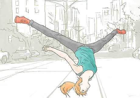 Roll to absorb landing impact safely. Rolls can be done at the end of a controlled drop or after an unexpected fall. Their purpose is to spread out the force of impact, preventing injury. With practice, a quick roll can even be done painlessly on concrete. Until then, it's best to practice on soft surfaces, such as grass and gym mats. To execute a roll diagonally across your back: When practicing, begin in a standing position with one leg slightly forward. The leg in front should correspond to the same side as the shoulder you plan on rolling onto. Crouch down into a squat, placing your hands on the ground palms down. The hand of the side you're rolling into should be slightly behind the other, making a diagonal line with your front foot. The opposite hand should form a straight line with your back foot. Push with your front leg to create momentum. Roll onto the corresponding arm and then drop onto your shoulder. When your shoulder hits the ground, tuck your back leg into your side. Shift your weight and use your momentum to roll from your shoulder to your hip on the opposite side. Hit the ground with your front foot first as you finish your roll. It's extremely important to keep your head up and away from the ground at all times.