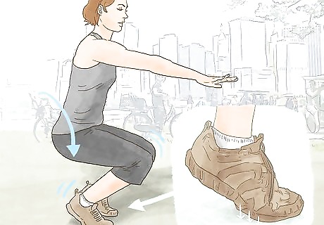 Land solidly. Any time you land, you will need to do so safely. In general, you will be landing upright on two feet. This could easily cause injuries to your knees and wear out your joints over time if not done properly. Keep the following in mind when landing: Land on the balls of your feet. This is the semi-flat space between the toes and the arch. When you land, angle your feet pointing downward while lifting your toes. Don't land with your legs straight. Bend your knees to absorb the shock of your landing. Never bend your knees to an angle less than 90 degrees.