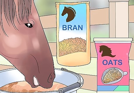 Offer the mare bran and oats in the last week before delivery. About a week before you expect your mare to go into labor, reduce the amount of grain you’re giving her. Instead, each day, give her 2 lb (910 g) of oats and 4 lb (1,800 g) of bran, divided into 2 meals. After the foal is born, gradually increase the mare’s grain until her feed is back to normal. This may help prevent your mare from becoming constipated before or after the delivery of the foal. Always check with your vet before you make changes to your horse’s diet.