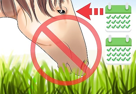 Keep the mare away from fescue grass 45-60 days before the foal’s birth. If your mare regularly grazes on fescue grass, move her to another pasture or board her indoors about 6-8 weeks before the foal is due to be born. Fescue grass can lead to an increased risk of lowered milk production and complications during delivery. Fescue is a type of tall grass that is normally fine for horses to eat, but it's high in alkaloids, which are dangerous to the foal. The grass is also susceptible to infection from an endophyte fungus that can produce even more alkaloids.