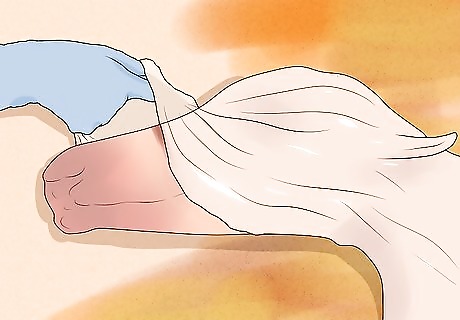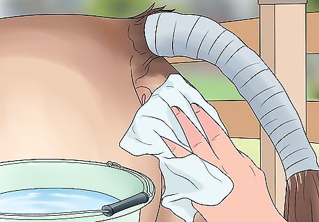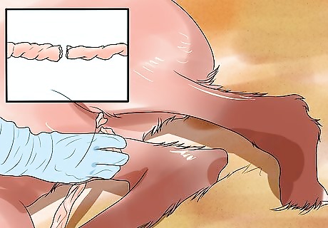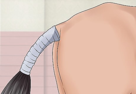 Wrap the mare’s tail when she starts to seem anxious or colicky. When a mare starts to go into labor, she may be easily excitable, restless, or irritable, and you might see her repeatedly stand up and lie down, kick at her belly, or even bite at her flanks. She may also urinate more than usual. When you see this, braid the mare’s tail, then tie it up with a clean wrap so it will be out of the way during the delivery. These signs indicate that the mare is in the first stage of labor. Sometimes a mare may only stay in the first stage for about 20 minutes, while other times it may take her several hours to progress to the second stage. Warning: Don’t wrap the mare’s tail too tightly. If the wrap cuts off the circulation to her tail, it could cause permanent damage.