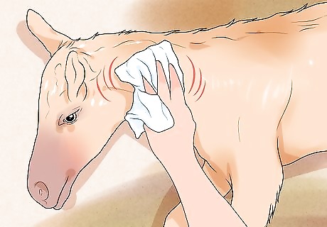 Rub the foal vigorously with a towel if it isn’t breathing well. Sometimes, foals need help to start breathing on their own. If it’s not breathing, or if it’s breathing weakly, rub the foal’s neck, chest, and sides with a clean, dry towel. This can help stimulate its breathing and circulation. Have someone else call the veterinarian while you rub the foal with the towels.