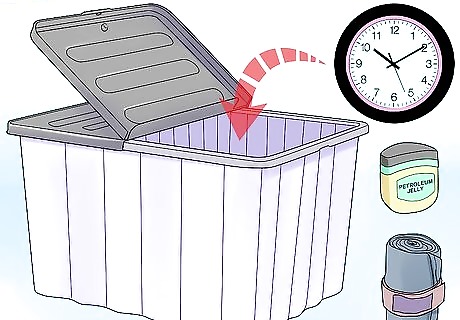 Store any supplies you’ll need in a large plastic container. Foaling can happen very quickly, so it’s best to gather up everything you might need ahead of time. Store it in a large resealable container to keep everything as clean as possible, and place the container near the birthing stall or inside the area you’ve sectioned off in your pasture. While you should discuss the exact supplies you’ll need with your vet, here are some things you might want to have on hand: Watch or clock for timing the stages of labor Tail wrap for the mare Petroleum jelly and sterile plastic gloves in case you need to reposition the foal Halter and lead-rope in case you need to guide the mare Mild soap Head-mounted LED lamp or a flashlight with extra batteries Clean towels in case you need to wipe down the foal Clean buckets for carrying water, holding dirty towels, and collecting the placenta String and scissors in case you need to tie off the umbilical cord