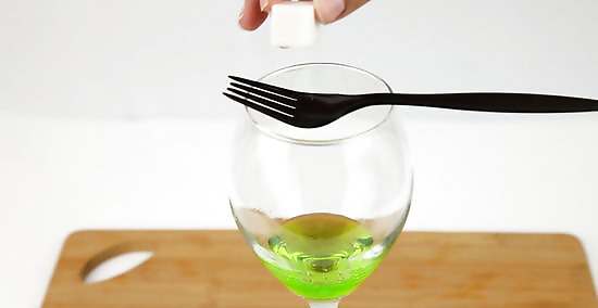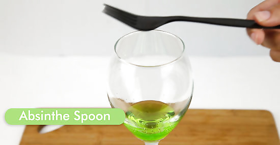 Rest the absinthe spoon across the mouth of the glass. An absinthe spoon is a special slotted spoon that sits on top of a glass and holds a sugar cube. That way, you can pour water over the sugar and into the glass to dissolve the sugar into the absinthe. Some spoons will have a notch on the back of the spoon to secure the spoon to the rim. If you don't have an absinthe spoon, lay a fork across the mouth of the glass so you can place a sugar cube on the tines.