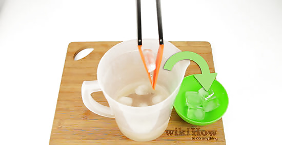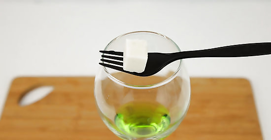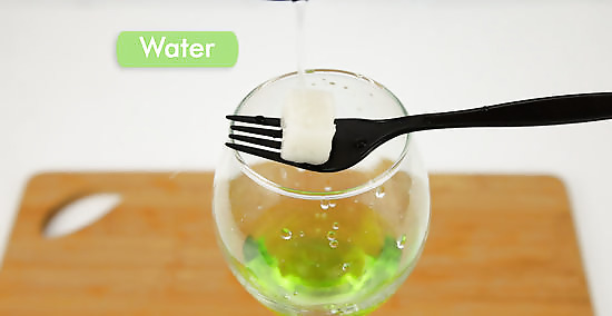 Saturate the sugar with a few drops of water. Pour 3 to 4 drops of water over each ice cube to soak it with water. Leave the water to saturate the sugar for about a minute. This will give the water time to start dissolving the sugar.