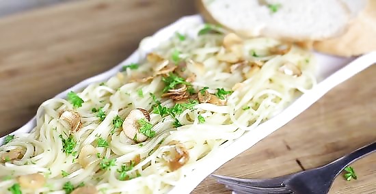 Angel hair pasta with olive oil, garlic and Parmesan cheese. A classic way of preparing angel hair pasta is with garlic and olive oil. For 1 lb. (0.45 kg) of pasta you'll need 3 tbsp. (45 ml) of good quality olive oil. Pour the olive oil into a skillet and crush 2 cloves of garlic. Add the garlic to the olive oil, turn the heat on medium and cook the garlic until just fragrant. Toss the freshly cooked and drained angel hair pasta with the olive oil and garlic mixture, serve and pass the freshly grated Parmesan around the table.