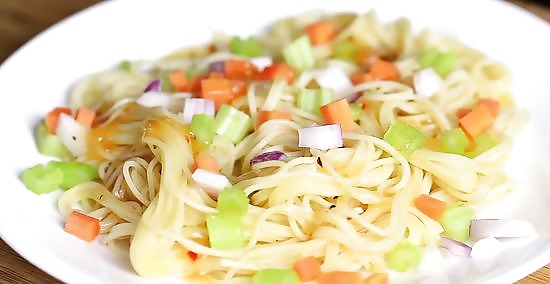 Angel hair pasta salad. After cooking the angel hair pasta, drain it and rinse it under cold water until it is cool to the touch. Combine the pasta with 3 stalks of celery that have been diced finely, 3 sliced green onions, 1 grated carrot and 1/4 cup (60 ml) of your favorite bottled Italian dressing. Toss to combine all ingredients and refrigerate it until ready to serve.