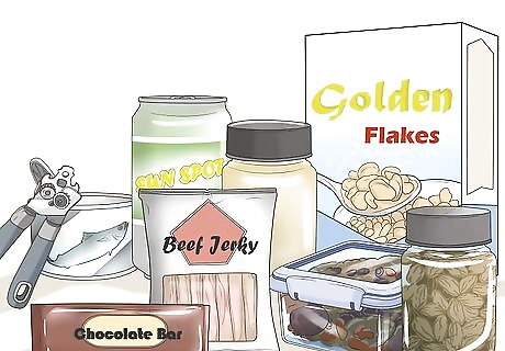 Gather non-perishable food items and store them in a plastic container. In case of rain or bad weather, keeping the food sealed will protect them from getting waterlogged. Let your kid pick a few items to pack away, too, so that there will definitely be something there they will like. Check your food items once per year to replace items or add to your pack. Non-perishable items to consider packing: Dried fruit Canned tuna fish (don’t forget to pack a can opener!) Peanut butter Protein bars Canned juice Jerky Dry cereal Chocolate Nuts