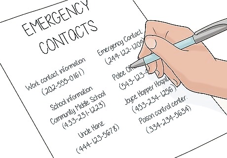 Create a list of emergency contacts. Keep this list in several different places so it’s always accessible. Have it on the fridge, keep it saved in your phone, have a hard copy in your bag or car, and put one in your child’s backpack. Contacts to include on your list: Your contact information at work Your child’s school information Emergency contact Other family members, like siblings, aunts, uncles, and grandparents Trustworthy neighbors or friends in the area Doctor and pediatrician information Police station Poison control center Local hospital