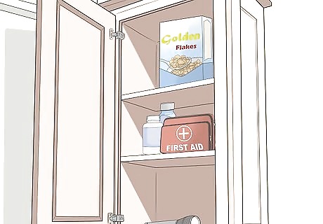 Choose a location in the home for your emergency kit and supplies. If your child is home alone when a disaster occurs, they need to know where the flashlights, food, medicine, and extra supplies are. Also, having a designated spot for your emergency kit will make it much easier to grab whenever it’s needed, whether you need to take it to the basement or get into the car to head out of town. Pick an easy to reach spot, like the floor of a closet on the main level of your home, or underneath a bed.
