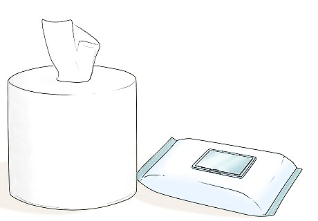 Stockpile toilet paper, moist towelettes, and other disposable goods. Ask your kids to pretend like they’re going camping or on a long road trip, and think through the normal activities you might have to do differently, like showering, washing up after dinner, or going to the bathroom. Gather the essentials, like paper plates, plastic forks and spoons, period products, paper towels, and similar items so you can eat and clean up as best as you can during an emergency. Add a few garbage bags to your kit, too, so you can keep things as clean as possible.