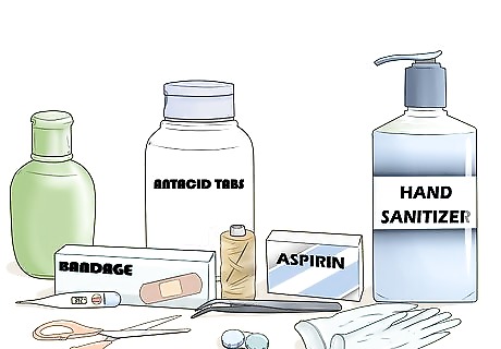 Keep a first aid kit with extra prescriptions of medications or inhalers. You can buy a stocked first aid kit from the store, or you can assemble your own. Use something water resistant to store your supplies. Check your kit every year to replace expired medicine or used-up bandages. Things to include in your first aid kit: Multiple sizes of bandages Scissors Tweezers Latex gloves Thermometer Hand sanitizer Safety pins Sewing needle and thread Ointment Antacids Pain relievers If you wear contacts or glasses, keep an extra pair in your kit, too.