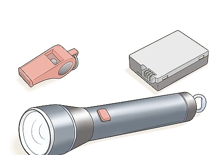 Gather safety items, like a whistle, flashlights, and an extra cell battery. Matches, a fire extinguisher, dust masks, a battery-powered radio, and similar items can really come in handy in an emergency. Assume you may not have electricity for a few days and have your kids come up with alternative ways to do things, like make a fire, get the news, and signal that you need help. If you live in a flood-prone area, you may also want to stock life jackets for you, your kids, and any pets.
