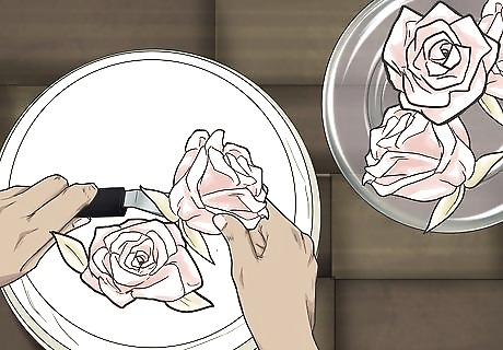 Remove any sugar flowers before wrapping the cake. Use a flat knife to scrape off any sugar flowers or other cake decorations. Put these aside in a bag or on a plate. If these decorations are made out of bakery frosting or sugar paste, they won’t go bad if left in refrigerated. If the frosting is made with perishable ingredients, like mascarpone or whipped cream, then it needs to be refrigerated.