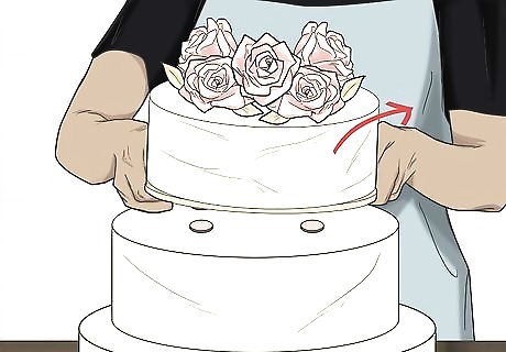 Remove the top tier of the wedding cake after the cake-cutting ceremony. Store it in a cool environment throughout the wedding event, like a dining room that’s 68 °F (20 °C). Most importantly, don’t leave the cake in an especially hot area, like in direct sunlight or in a hot car. While these desserts are difficult to preserve due to their size, many couples opt to save some of the cake for a later event, like their first anniversary.