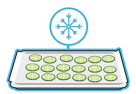Place the cucumber slices on a baking sheet. This will make sure they freeze evenly. If you just put them in a zippered freezer bag, then the cucumbers slices will freeze clumped together. You can line the baking sheet with parchment paper to make it easier to remove the cucumbers when frozen. Once frozen, you can move the slices to a zippered freezer bag for easy storage. Frozen cucumbers can be used to infuse water, make dips, and make smoothies.