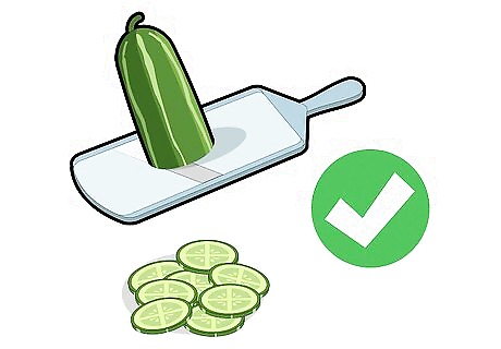 Slice the cucumbers. How thin you slice the cucumbers is based on your preference, but you usually want to make sure they are very thin. Try to keep the thickness uniform; this will allow the cooking time to remain consistent. If you are planning to bake the chips on an aluminum foil lined baking sheet instead of a parchment paper lined baking sheet, then make the cucumber slices slightly thicker. Use a mandoline slicer to make sure your cucumbers are sliced to a uniform thickness. If you don’t have a mandoline, you can eyeball it.