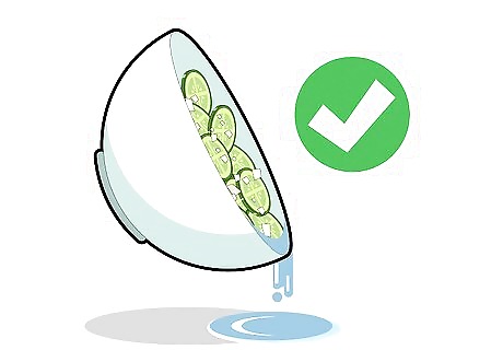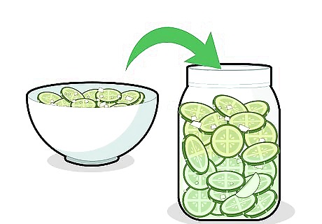 Drain the excess liquid from the cucumber onion mixture. Cucumbers are full of water, so there will be water collected at the bottom of your cucumber and onion mixture. You don't want that in your pickling jars. Pour the remaining liquid out, being careful not to drop any of the cucumbers out of the bowl. You can use a strainer with smaller netting. That will keep the onion and cucumbers from falling out with the excess liquid.