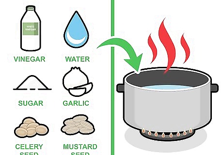 Combine vinegar, water, sugar, garlic, celery seed, and mustard. In a pot, mix the ingredients together to make the brine. You will have about 2 cups (470 mL) of brine. Set the pot on the stove and bring the mixture to a boil, stirring occasionally. Boil for around two minutes or until the sugar has dissolved.