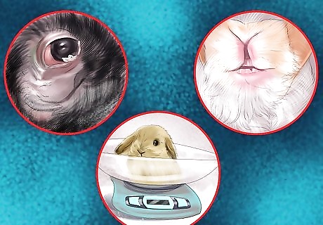 Look for symptoms of dental problems. If your rabbit has slowed down its chewing, look for secondary symptoms. You should be suspicious that your rabbit has dental problems if you notice the following: A Wet Chin: Dribbling or drooling is due to the pain associated with moving the tongue to swallow. The rabbit finds it easier to dribble than to swallow. Weight Loss: Dental problems always need to be considered for any rabbit that is losing weight. If the teeth are painful, the rabbit will be reluctant to chew and decreased eating leads to weight loss. Messy Eating: If the rabbit starts becoming a messy eater, scattering food, or leaving partially chewed food on the floor, this can be a sign of dental discomfort. Sticky Eyes: While it might seem strange, a thick, white discharge from the eyes is a common sign of dental problems. This is because the overgrown roots of the teeth in the top of the mouth can compress the tear ducts and prevent tears from draining from the eye in a normal manner. Lack of Grooming: A rabbit with a sore mouth is less likely to groom, thus its coat will become dull and unkempt. Jaw or Cheek Abscesses: Overlong tooth roots commonly become infected, which results in abscesses breaking out at the surface.