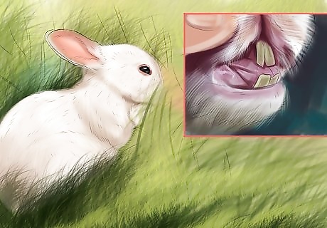 Look at your rabbit's teeth. Rabbit teeth can get overgrown in several ways. These include: Overgrown Incisors: These are the gnawing teeth at the front of the mouth. These can become overlong and curl around, interfering with the rabbit being able to eat. In extreme cases the teeth can grow around and dig into the lips. Overgrown Molars: These are the cheek teeth that you are unable to see routinely because they are the back of the rabbit's mouth. If the molars grow too long they can interfere with the rabbit's ability to fully close its mouth. Molars with Spurs: Uneven wear on the cheek teeth leads to the development of sharp spikes, or spurs, on the edges of the teeth. These can dig into the cheek or tongue and causes bleeding. In extreme cases the spurs can be so long they grow over the tongue and stop it from moving. Overlong Roots: The roots of teeth also grow, which can result in the roots pushing downward through the jawbone, causing painful dental abscesses. Alternatively, the upper roots can grow upward and compress other structures in the head, such as the tear ducts.