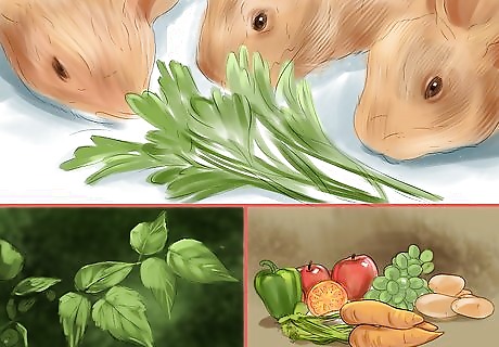 Feed additional vegetation. In addition to hay, feed your rabbit a variety of fresh vegetables, weeds and wild plants, as these are high in calcium. Ideal fibrous weeds include dandelions, brambles, and tree leaves. A selection of fresh vegetable should be offered daily. Ideally, rotate what you give the rabbit and avoid giving the same vegetable every day for several days, as this could overload the system with certain minerals. The simple act of varying what you give prevents this.