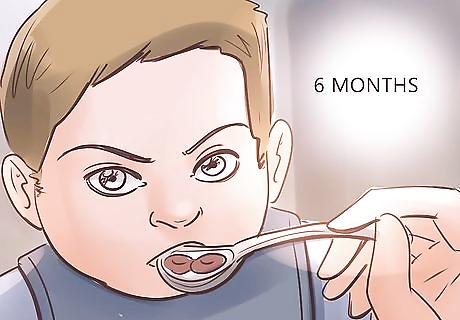 Introduce solid food at age 6 months. At 6 months old, your baby starts to need more iron from their food. At this time, start to incorporate iron-fortified cereal mixed with formula or breast milk into your baby's daily diet. When they acclimate to the cereal, you can begin to feed them pureed fruits, vegetables, and meats. Waiting too long to add solid food to their diet increases their risk of iron deficiency. However, introducing solid food too soon is not recommended either. It's best to start at introducing solid food at 6 months.