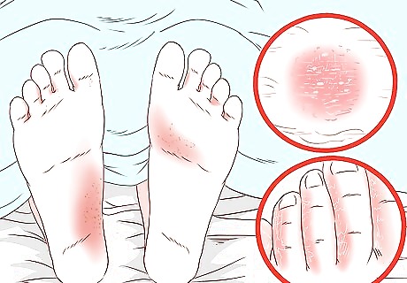 Recognize the symptoms for athlete's foot. Athlete's foot, also called tinea pedis, causes red or itchy skin around and between the toes, and less often on the soles of the feet. You may experience burning or stinging pain and the skin will blister and crust. You may also find red, scaly bumps between your toes.