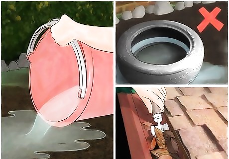 Remove standing water. Mosquitoes breed and lay eggs in standing water, which can increase the mosquito population in your area and increase your chance of contracting Zika. Make sure that you remove any items that might collect water, such as buckets, old tires, or flower pots. Fill in small puddles with sand or dirt to eliminate this potential breeding ground as well.