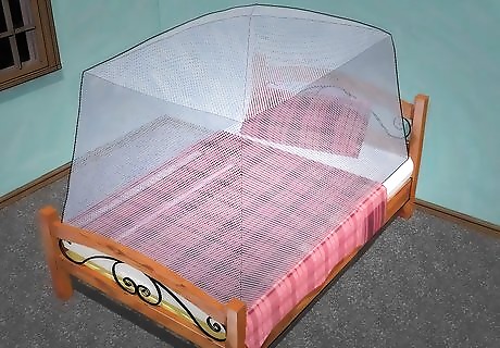 Sleep with a mosquito net. Mosquito nets can protect you from bites while you sleep. Inspect your mosquito net to make sure that it is free from holes or tears. Also, make sure that it touches the ground and goes all the way around your bed. Some mosquito nets are even treated with permethrin, which offers even more protection from mosquitoes during the night.