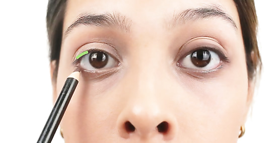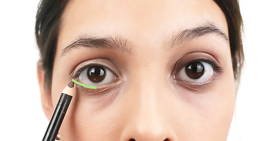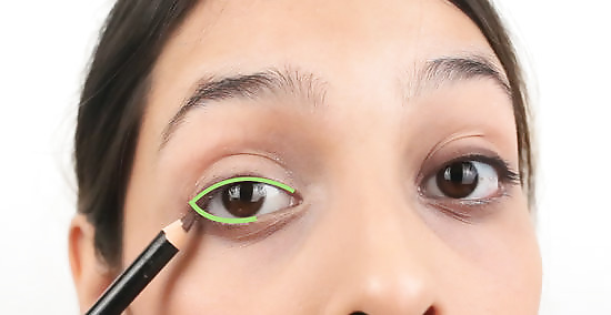 Create a cat eye with contrasting colors. Line the upper lid with a smoky colored eyeliner. Smudge it a little with your fingertip. Next apply the same smoky shade along the bottom ⅔ of your lower lid, under your lash line. Connect the corners and draw a little wing upward towards your brow. Sweep a little light, pearly shadow in the inner corner of your eye to create a contrast that will widen your eye.