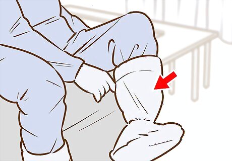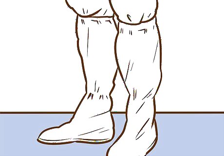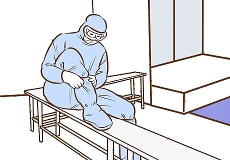 Slide on your boots. The last thing you will put on is your boots. For this step, you will use the crossover bench as a barrier. Slide one boot on, making sure that it only touches the floor on the clean side of the room (your other foot should still be on the dirty side of the bench). Next, slide the other boot on ensuring that the second boot only touches the floor on the clean side of the room. At this point, you cannot go back to the dirty side of the room. Again, disinfect your gloves.