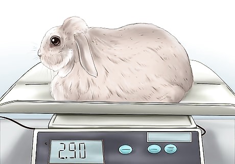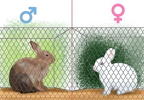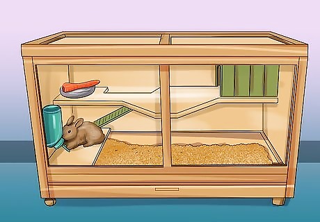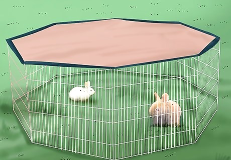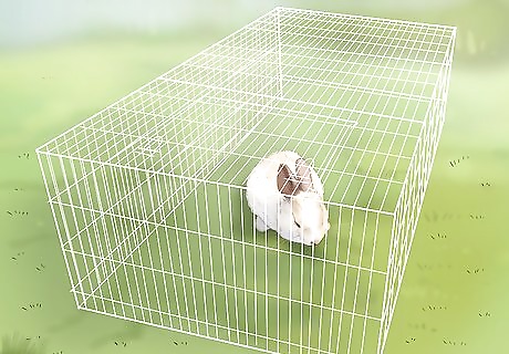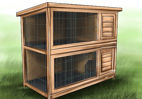 Get the right pen. The pen should be a minimum of 5 feet (1.5 m) by 6 feet (1.8 m) for this large breed, but slightly smaller for the smaller breeds. Rabbits need space! The floor should be made of a sturdy wire mesh with about ⁄4 inch (1.9 cm) square holes to accommodate droppings and urine. Do give the rabbit someplace else to stand, however. Standing on wire full time can hurt a rabbit's feet. A full tray or box the full size of the floor of the pen with all four sides about 2 ⁄2 inches (6.4 cm) high should be slid under the pen to catch the animal waste. This tray should be emptied once per week and rinsed with a disinfectant. Be careful when using bleach, as it will react with the urine and give off a harmful gas! A solid compartment about 1 ⁄2 feet (0.5 m) long and 1 ⁄2 feet (0.5 m) wide should be included in the pen to give the doe privacy while she is having her young. this will keep the mortality of the young down to a great extent. Be sure there is plenty of dried hay in the pen when she is "due".