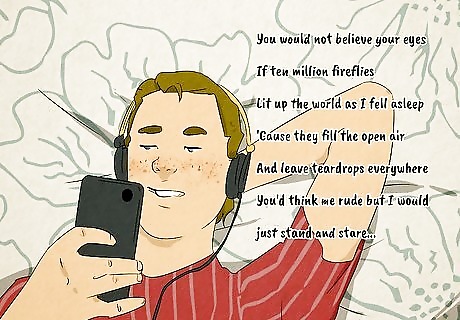 Move around to enhance the listening experience. Studies show that listening to music stimulates the brain’s reward centers, while dancing activates its sensory and motor circuits. In other words, listening while moving can create an even more immersive and pleasurable experience. Focus on the instruments and melodies within the song, and feel free to dance along to the beat. Alternatively, listen to music while driving along a scenic route. The visual stimulation may help increase the colors and textures in the song.