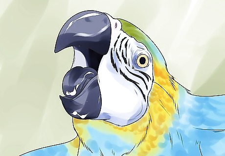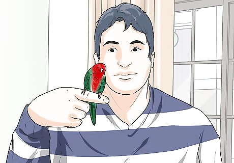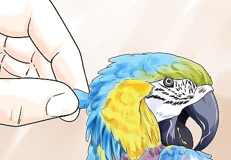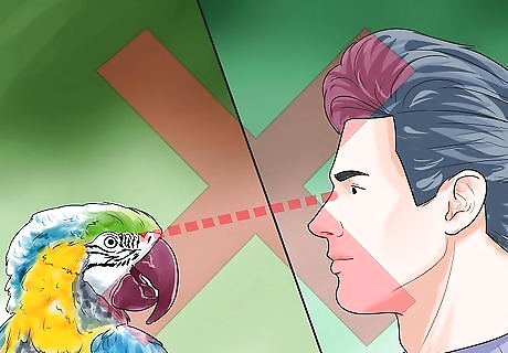Avoid intimidating your parrot. Parrots will view certain movements and actions as threatening or intimidating. These movements, even in unintended, can cause your parrot to feel stress. Try to avoid approaching or interacting with your parrot in some of these ways to help keep it calm and relaxed: Don't loom over top of your parrot. Always approach your parrot on its level. Don't move quickly or suddenly towards your parrot. Avoid making prolonged eye contact with your parrot.