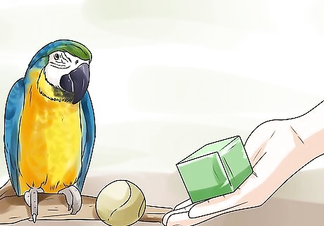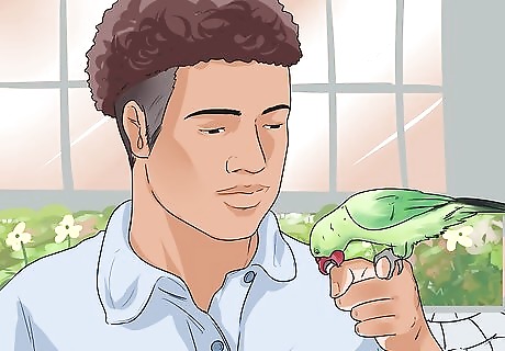 Keep your parrot entertained. Parrots are highly intelligent creatures that will need to be entertained and engaged. You'll want to provide plenty of fun and challenging puzzles and toys for your parrot to play with. These toys are especially important if you have to leave your parrot alone for any length of time during the day. Provide a wide range of toys and puzzles for your parrot. Branches from non-toxic trees, hard or soft shell nuts and broccoli can all make great toys for your parrot. Avoid offering metal toys or toys with pieces that could break off and be swallowed by your parrot. Regularly changing out toys can help keep your parrot engaged and entertained. Allow your parrot time outside of its cage to give it a change of pace. Spend lots of time talking with your parrot or teaching it tricks, like how to talk back to you.