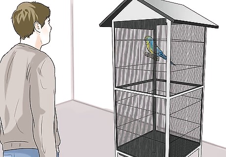 Place your parrot's cage in a calm spot. Parrots are easily startled by loud or sudden noises. Parrots can also be scared by having a person or other animal suddenly appear near their cage. You'll want to make sure your parrot's cage is in the most relaxing space it can be to help cut down on stress. The area near your parrot's cage should be quiet. You'll want to put your parrot's cage in a place that allows it to see the entire room it is in. Placing the parrot's cage near a window can cause them stress.