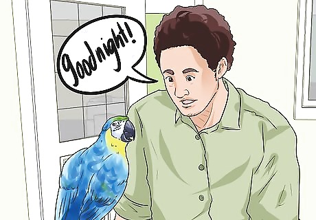 Create some everyday routines. Parrots enjoy knowing what to expect and can benefit from establishing regular routines in their lives. If your parrot is showing signs of being stressed out, you'll want to establish some regular activities to help keep it calm. Try implementing some of these ideas into your daily parrot care routine: Saying goodnight to your parrot in the same way each night can help it relax in the evenings. For example, you might open your parrot's cage in the morning and say "Good morning." Each night, when you put your bird in its cage, you might say something like "Sleep tight." Try to let your parrot in and out of the cage the same way each time. Offer treats in the same way to help your parrot know that something tasty is on the way. Try to feed, water and let your parrot out of its cage at the same times each day.