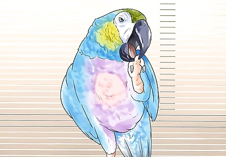 Check out your parrot's body language. There are a few movements and motions that your parrot may exhibit while stressed out. These behaviors can indicate that your parrot is trying to release some nervous energy or signal that something is wrong. Try looking for some of these behaviors to learn if your parrot may be stressed: Standing on one leg and biting the nails of the other foot can be a sign of stress. If your parrot is moving its head in a figure-eight pattern, it may be stressed out. Any kind of rocking or pacing can indicate high levels of stress.