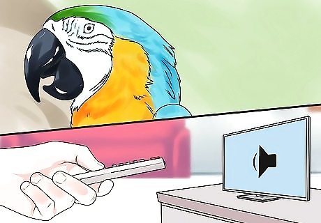 Keep things quiet. Birds are prey animals and will be easily startled by loud and sudden noises. These noises can make your parrot feel like danger is close-by, even if the noise itself was nothing to worry about. Always keep things quiet and calm around your parrot to avoid stressing it out. Having a radio or television on low volume should be fine for your parrot. Playing loud music or making sudden loud noises can stress your parrot out. Having any loud machines or devices near your parrot's cage can cause it stress.