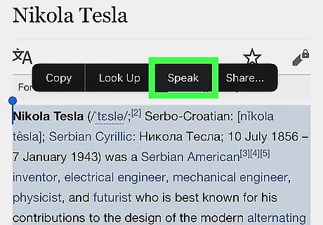 Double-tap the text you want read aloud. This will select and highlight the text you tap on. A black toolbar will pop up above your text selection. You can hold down either end of the highlight, and move it to change your text selection.