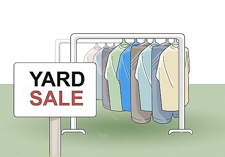 Hold a yard sale to sell your clothes. Sometimes, the tried-and-true yard sale is the best way to sell a bunch of your clothes. Post signs around your neighborhood and post on social media advertising the date and time of your yard sale. Organize your clothes into neat sections and wait for people to come through and purchase your clothes. Choose a Saturday morning with nice weather to host your yard sale to attract more people. Label the prices of your clothing clearly.