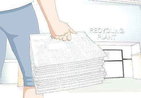 Take your newspapers to a recycling plant if your city doesn’t pick up. If your local government doesn’t recycle or they refuse to take newspapers, you can take them to a plant yourself. Look online to find recycling plants in your area. Call the closest plant and ask them if they take newspaper. If they do, wait until you’ve filled a bin with newspapers. Then, drive them to the local plant and drop them off for recycling,Tip: Wait until you have a full bin before dropping your newspapers off. This way you’ll cut back on greenhouse emissions by limiting the number of trips to the plant. Unless the plant has a special focus on materials that are difficult to process, the recycling plant near you will have no problem taking your newspaper. Most municipal plants do not charge a fee for dropping materials off.