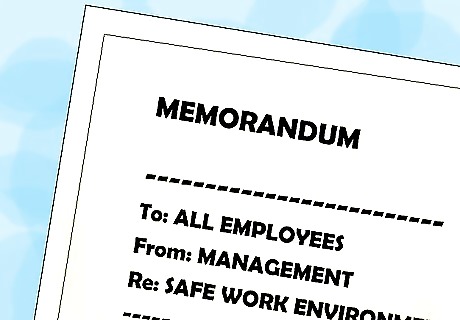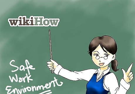 Communicate your expectations for a safe work environment. Let your staff know on a regular basis that safety is a major concern in your business. You can do this verbally and you can reiterate your expectations in memos. You can also post safety information throughout your facility. Words are one thing, but act accordingly, too. If someone encounters a possible safety hazard, move quickly to correct it. Don't wait for it to correct itself or assume that someone else is going to do it. Ask your employees whether they have any suggestions about improving workplace safety. One safety coordinator is certainly helpful, but a handful of ears and eyes is almost always preferable to just one. Create an anonymous input form that employees can fill out at their discretion. Foster a culture of safety in the workplace by encouraging open communication, mutual respect, and teamwork. Encourage employees to report safety hazards or incidents, and to support each other in maintaining a safe work environment.
