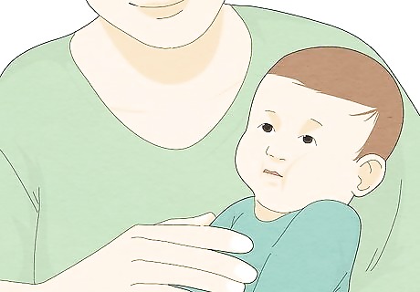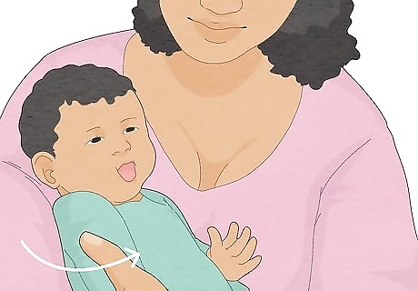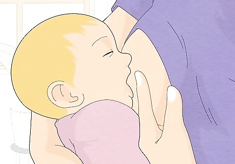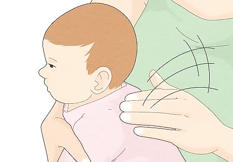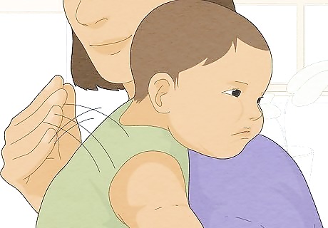 Burp the baby while you wait. Burping the baby can release some of the hiccup-causing gas in his or her stomach. Place the baby upright across your chest so the baby's head is on or a little above your shoulder. Rub or gently pat the baby's back. This helps the bubbles of gas to move. Resume feeding after the baby burps, or wait a few minutes if the baby does not burp.