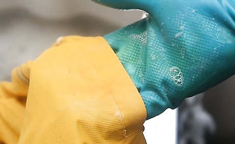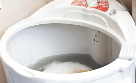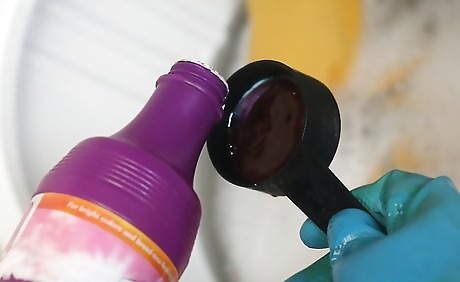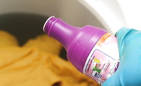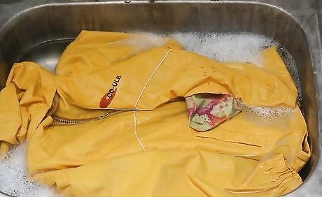 Put the clothes in a sink with a cap full of liquid laundry detergent and 2 tablespoons (29.6 ml) of dish-washing detergent. Mix the detergents in the water before adding the clothes. Make sure the clothes are fully covered with water and let them sit for a good hour.