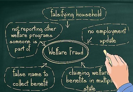 Know the different forms of welfare fraud. Once you understand the basic structure of the welfare system, you need to know what types of fraud exist. In general, the term welfare fraud refers to the taking advantage of welfare benefits improperly or illegally in order to receive assistance when it should not be given. Welfare fraud often occurs when someone falsifies or leaves out critical information in their application to receive welfare benefits. The different types of welfare fraud include: Falsifying household compositions and sizes; Purposely not reporting income and/or employment updates; Purposely not reporting other welfare programs someone is a part of; Using false names to collect multiple benefits; and Claiming welfare benefits in multiple states when not authorized to do so.