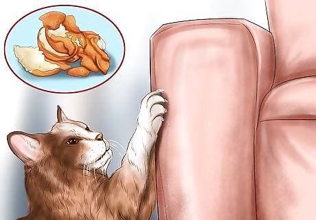 Make your cat’s bad behavior undesirable. Your cat can certainly cause your love to wear thin if he is scratching up your furniture or attacking you. Rather than reprimanding him with harsh words or physical punishment, you can try other ways to make his bad behavior undesirable. For example, if your cat is scratching your sofa, you can make your sofa undesirable by placing orange peels by the sofa (cats don’t like the citrus smell) or putting double-sided tape on it. If your cat is attacking you by playing too roughly, you can give him a time out. By not giving him attention, he will realize that his behavior is not rewarding, and will learn not to play roughly with you. If your cat likes to jump up on countertops or tables, you can place an upside-down mousetrap on the surface that will flip upward when he steps on it. This will be upsetting enough to get your cat to stop this bad behavior, but will not injure him.