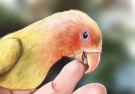 Use body language to discourage your bird’s bad behavior. If your bird tends to bite, you can communicate through your body language that this behavior is unacceptable. For example, if your bird bites you when he is perched on your arm, you can rotate your arm to throw him slightly off balance. Creating unbalance without causing him to fall will be just enough to let him know that he should not bite you. If he is perched on your hand, you can unexpectedly and slightly drop your hand to throw him off balance.